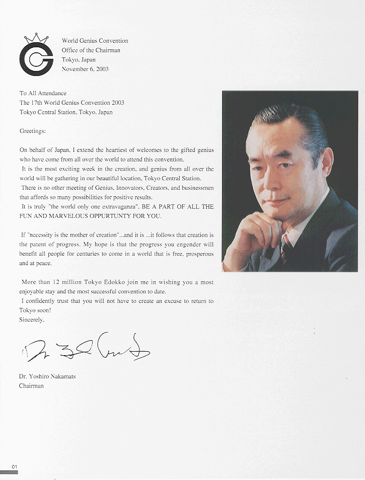米国ドクター・中松ワールドユニバーシティー大学総長 |
