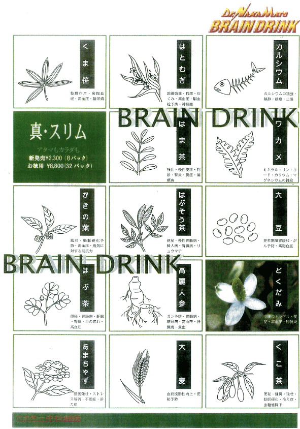 『ブレンドリンク』は、世界的天才が20年かけてブレンドしたお茶(頭茶)です。脳に、身体に総合的栄養を補う飲み物として発明され、ビタミンA・B・C・D・E、カルシウム、レシチン及びミネラル等が豊富に含まれております。