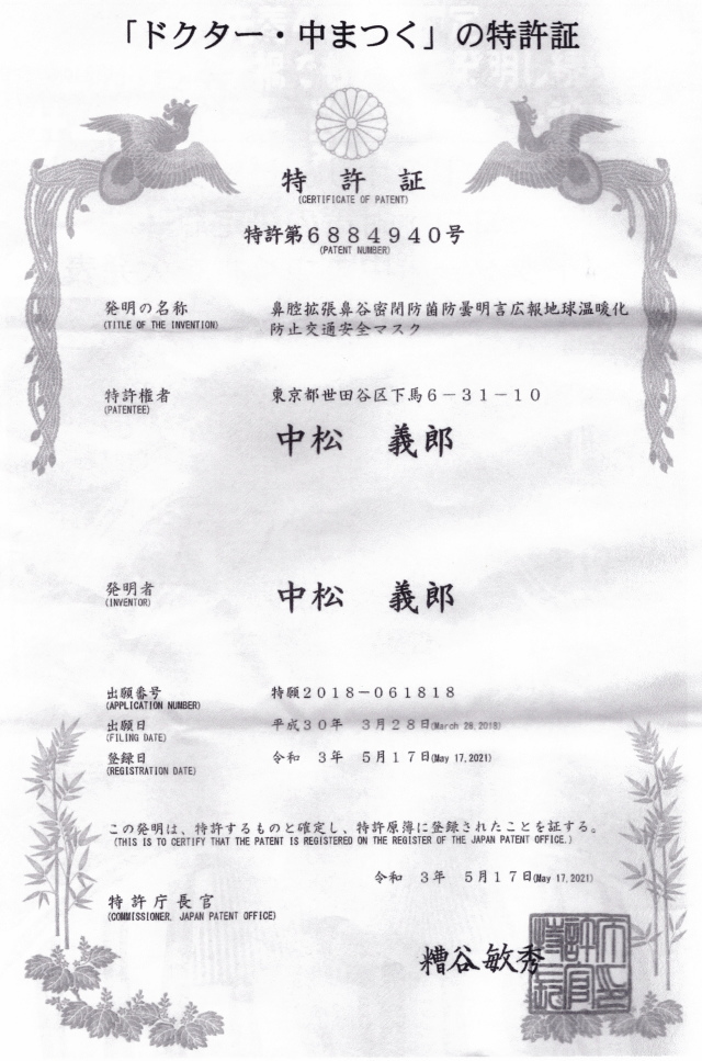 「ドクター・中まつく」の特許賞 登録日