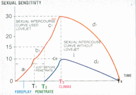 この表は私が考案しましたセックス方程式のカーブを表しています。セックス行為を科学的に。時間を横軸にセックス感度を縦軸に表しています。普通のセックスは下のカーブ(青線)になります。