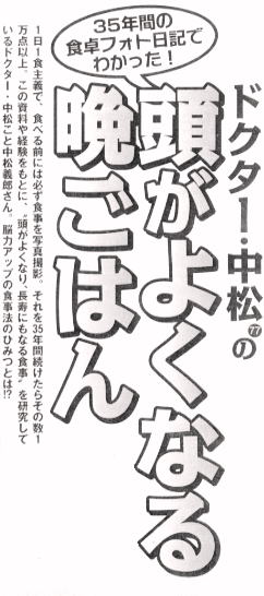 医学博士、工学博士、法学博士…であり、フロッピーディスクやジャンピングなどの発明家として世界的に有名な中松さんは、ここで紹介している黒ごま、いわしなどの食材が「頭のよくなる要素」ということを“発見”したほか、「1日3食より1食のほうがいい」との理論を打ち立てた。
