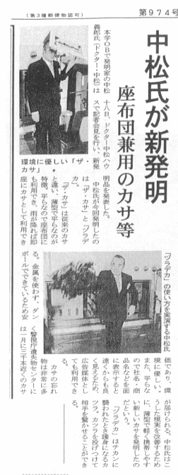 又、遺失物管理法が変わり、保管期間が6ヶ月から3ヶ月になりました。傘が一番忘れ物でたまるのです。そこで地球環境によい傘を発明しました。薄型で携帯にも便利、紙で出来ていますので「リサイクル」しても環境に悪くない。軽量で折畳めるので持ち運びに楽、利用度も幅広くピクニック、野球観戦、サッカーでザブトンになり雨が降れば傘として使います。座・カサなのです。今までの傘は丸いですから、文字が後ろの方にいってしまい全部見られないが、「ザ・カサ」は平らなので文字が全部見えます。だから新しい広告媒体として使えます。急に雨が降ったら皆さんに配布社名をPRすることが出来ます。