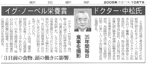 本年度、IGノーベル賞(The IG Nobel Prize) 「栄養学賞 Nutrition」 を中松義郎博士(ドクター・中松)が受賞。