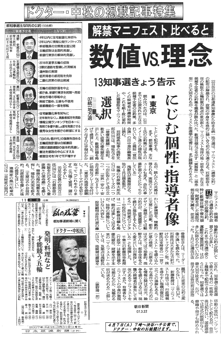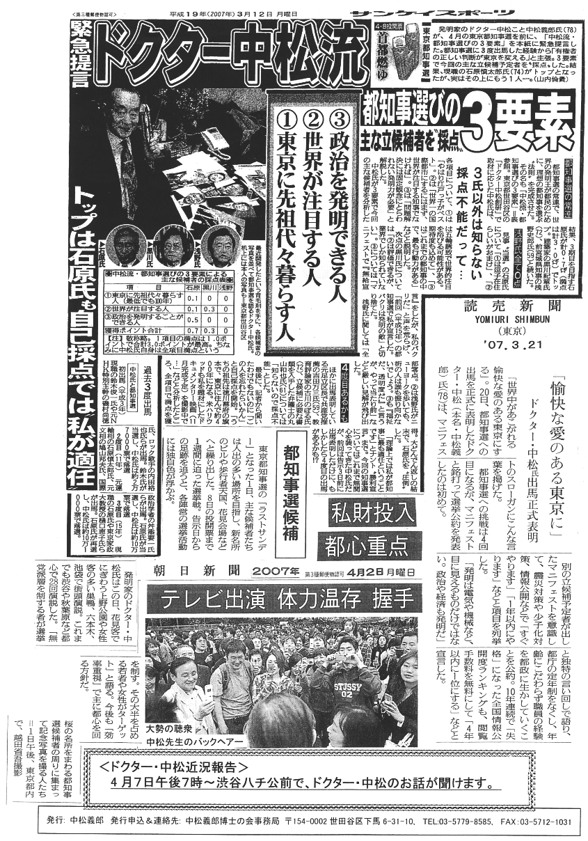 東京都知事選出馬表明 [政見内容・ドクター中松の掲載記事特集]