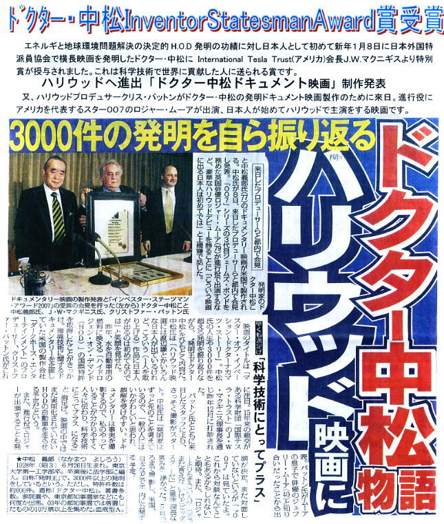 昨年、水を自動車用の燃料に換える「ハイドロジェン・オン・デマンド(HOD)」の国際特許を取得したことがきっかけ。環境技術に関するドキュメンタリーを企画していた米国の製作会社「ダークホース・エンターテインメント」のプロデューサー、クリストファー・パットン氏がこれに注目。15年来の親交がある科学財団「国際テスラ・トラスト」のJ・W・マクギニス理事長を通じ昨年12月に打診された。