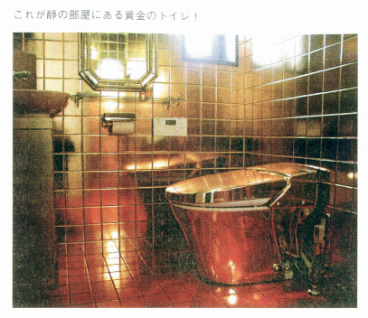 私が愛用しているトイレは、便器や床、壁、手洗い場や鏡のフレームに至るまで、すべてが24金でできています。天井まである細長い窓の大きさも、自然の光が入ってくる量を計算して作っています。最適な材質を探すなど、企画・基礎実験に10年、実際の製造・工事に2年半、合計12年半の月日とトイレだけで10億円の費用をかけてできた、私にとって理想的なトイレです。