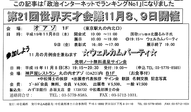 東京国際フォーラムでサー中松博士は記者会見を開催しました。内容は日本経済新聞社から「情熱賞」を受賞された件です。