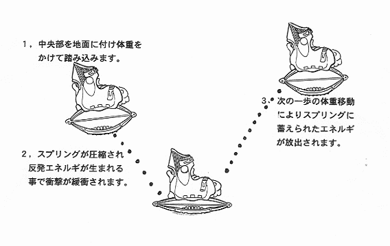 - バランス感覚が慣れてきたら、両足がぶつかったりもつれたりする事が無いように注意しながら軽く足を平行に動かして下さい。ただし、バネの下部中央または後部で着地するようにして下さい。前後左右に傾いて、走ったりしないで下さい。平らで安全な場所で、十分注意をしてください。
