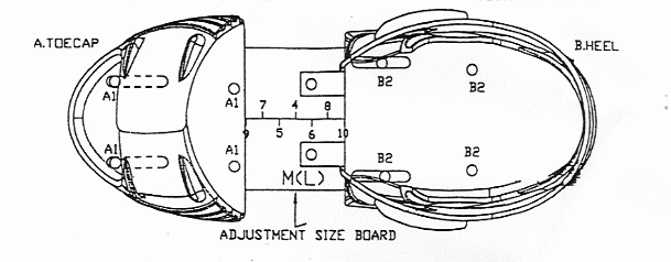- 合っていない場合は、付属の六角レンチで六角ボルトを緩めて調整表のつま先カバー位置番号・踵カバー位置番号に合わせて、それぞれの位置を確認しボルトをしっかりと締めて下さい。なお、もう一度全てのボルトが締まっていることを確認し3へお進み下さい。